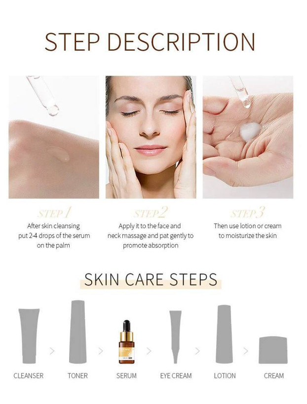 نحوه مصرف: پس از پاکسازی پوست، 2 الی 4 قطره سرم را روی کف دست خود بریزید، سپس آن را به طور مساوی روی صورت بمالید.
