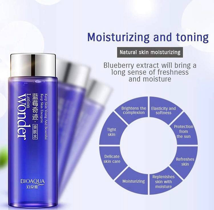 تونر جوانساز بلوبری مرطوب کننده، علاوه بر خاصیت رطوبت رسانی بالا، در سفید کردن پوست و افزایش درخشندگی پوست نقش مهمی ایفا می کند.